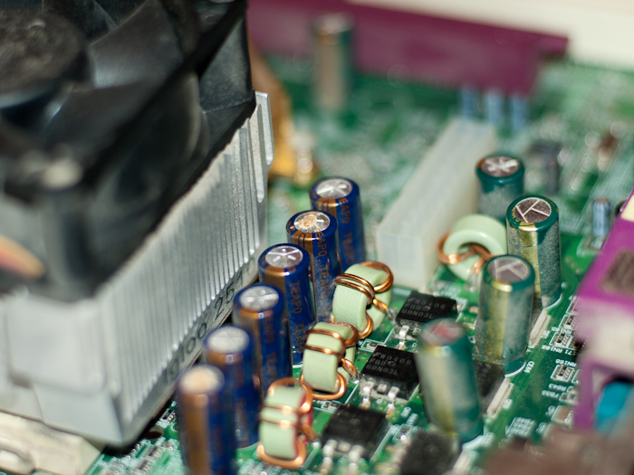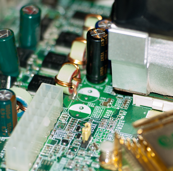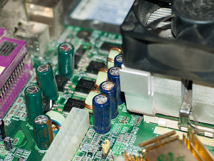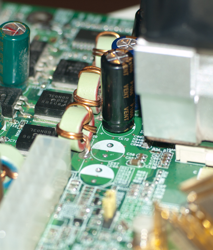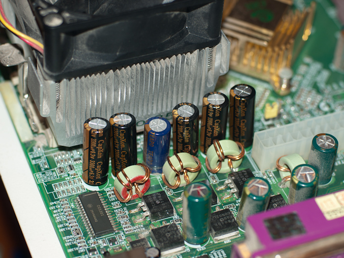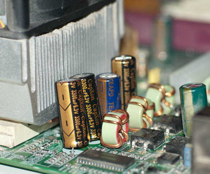 Пожалуй, наиболее частая причина сбоев или отказов материнских плат вызвана выходом из строя конденсаторов низковольтного сильноточного источника питания ядра процессора.