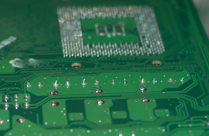 Переходные отверстия на материнской плате металлизированы, поэтому в них остается припой.