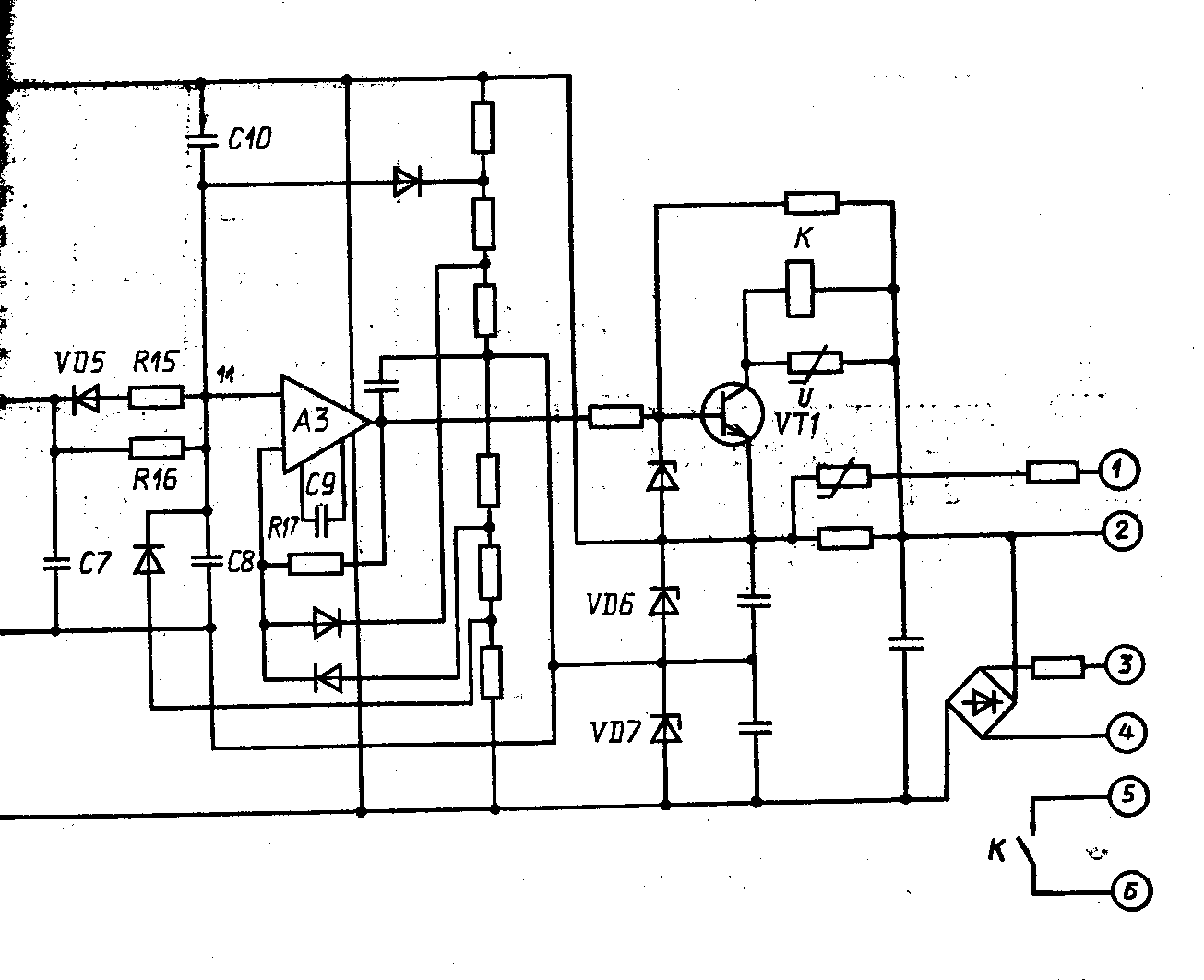 Сравнивающая часть реле состоит из порогового элемента на операционном усилителе А2, время-измерительной цепи VD5, R15, R16, С8 и триггера Шмидта на операционном усилителе A3. Конденсаторы СЗ—С10 служат для стабилизации работы усилителя, исключая его самовозбуждение. Резистор R17 создает положительную обратную связь. Выходной каскад реле выполнен на транзисторе VT1, в цепь коллектора которого включено быстродействующее электромагнитное реле К.